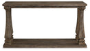 Homey. Hearty. Heavenly hued. Luring with a distressed weathered gray finish and square baluster legs set on a broad lower shelf for great presence, this sofa table is sure to make your homestead feel that much more like home. The look is beautified with elm veneers and a framed and plank-effect tabletop for a richly crafted masterpiece made for years of satisfaction.